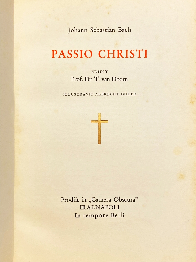 2. BACH, Johann Sebastian Passio Christi. Edidit Prof. Dr. T. van Doorn [= Lou van Strien]. Illustravit Albrecht Dürer. Iraenapoli [= Amsterdam], Camera Obscura [= F. Hoes], ‘In tempore Belli’ [= 1943]. Verguld halfperkament. 70 p. Op de titelpagina een kruis in goudstempeling. Fraaie blauwtintige kleurenillustraties naar Dürer, met beschermvloeipapier. [Typografie Joh.H. van Eikeren]. Gedrukt in een oplage van 250 genummerde exemplaren.