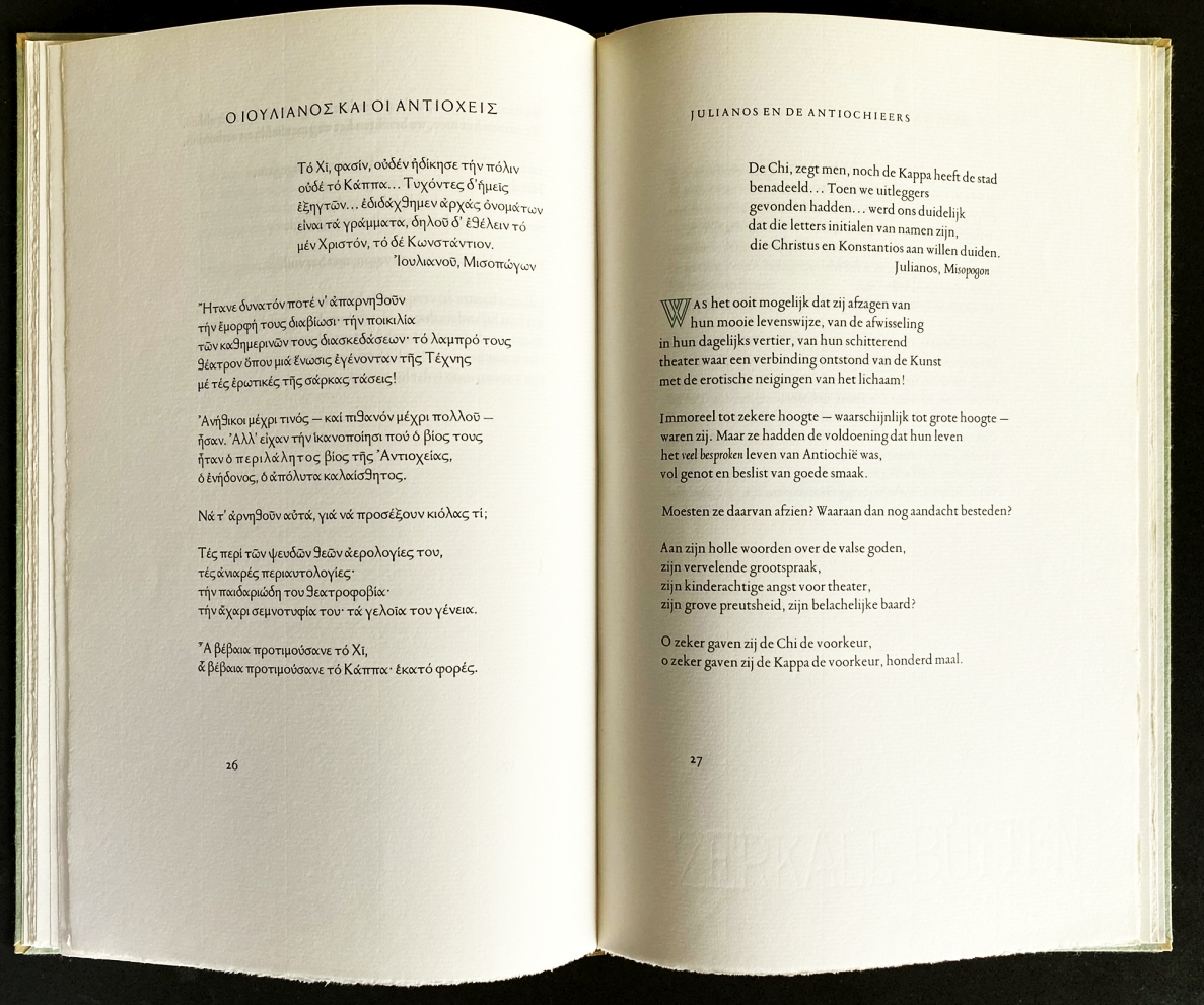 12. KAVAFIS, K.P. De Julianos-gedichten. Vertaald (en van een verantwoording voorzien) door Hans Warren en Mario Molegraaf. Amsterdam, Regulierenpers, 1987. 27,3 x 17,2 cm. Verguld halfperkament (Binderij Phoenix). 38 p. Met de hand gezet uit de Antigone en de Romanée en gedrukt in groen en zwart in een oplage van 60 [= 40] genummerde exemplaren. 1e druk.