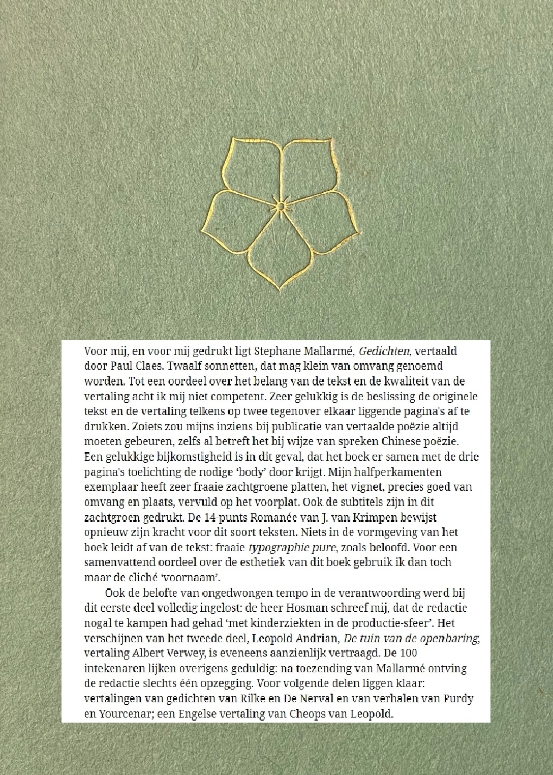 a. Stéphane MALLARMÉ, Gedichten. Vertaald door Paul Claes. Amsterdam, (Astèr), 1983. Verguld halfperkament met platten overtrokken met vezelig Japans papier (Binderij Phoenix). (2), 46 p. Gezet uit de Romanée en gedrukt door Confiance in groen en zwart naar typografische aanwijzingen van Ger Kleis in een oplage van 125 genummerde exemplaren. Bovenrand voorplat circa 2 mm licht verschoten.