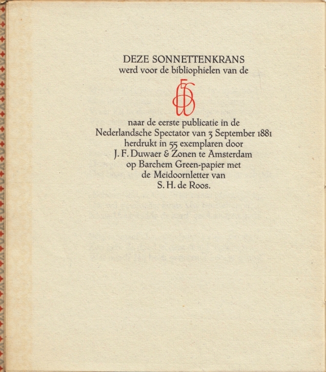 Los inliggend een (opgeplakt) exlibris van Herman de la Fontaine Verwey, mooi zinnebeeldig, rond, naar ontwerp van de sterke typograaf-kunstenaar S.H. de Roos (1877-1962, de zoon van een Friese meester-schoenmaker).