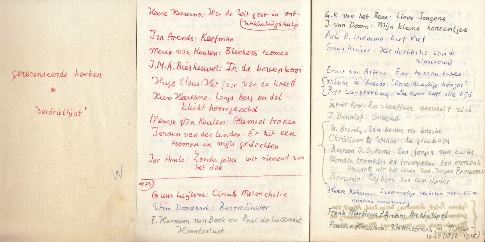 24. KOMRIJ, Gerrit Gerecenseerde boeken. ‘verdrietlijst’. Origineel handschrift. Ca. 15 x 10,5 cm. Vijf tot boekje gevouwen bladen. 1972-1974,