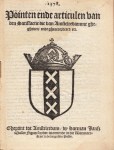 42. SATISFACTIE VAN AMSTERDAM 1578. Pointen ende articulen van den Satisfactie die van Amstelredamme ghegheven, ende gheaccordeert, etc. Amsterdam, Harman Jansz (= Barent Adriaensz, 1597?). Later kartonnen omslag. 16 p. Groot stadswapen met keizerskroon. Pag. 2 en 3 gezet uit de Civilité.