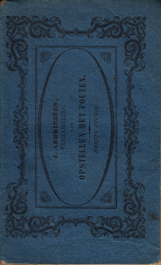 1. ANDRIESSEN, J. Verzameling van opstellen met fouten, tegen de taal, spelling, woordvoeging, enz. Eerste stukje Amsterdam, P.R. Otto, 1865. Ingenaaid met origineel uitgeversomslag. (4), 72 p. Achtste en op nieuw herziene druk. Rugje versleten, boekje ligt wat uit elkaar. Wat inktvlekjes, streepjes en droedels.