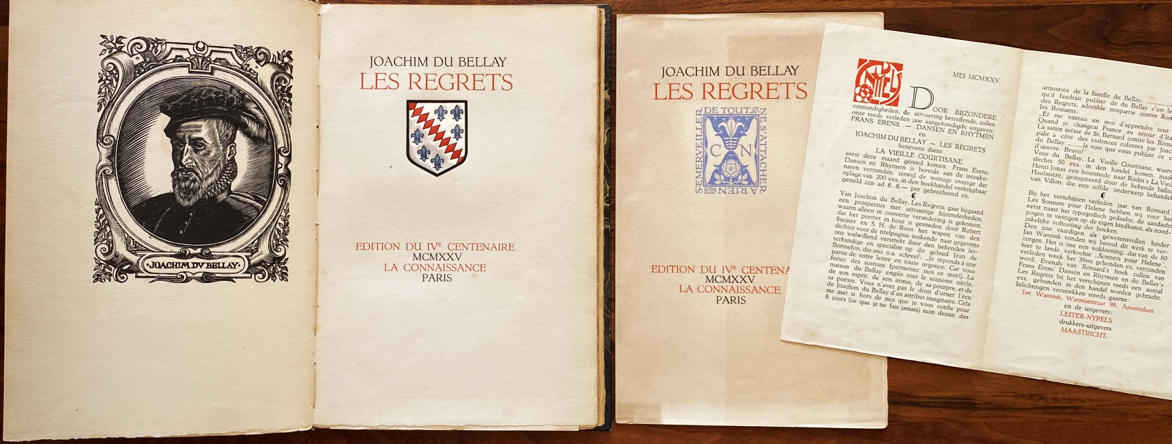 5. BELLAY, Joachim du Les Regrets. Paris, La Connaissance, 1925. Blauw halfmarokijn met 5 ribben en gemarmerde platten (Jan Wansink). 126 p. Met een portrethoutsnede door Robert Steiner als frontispice. Vignetten en barokke initialen van S.H. de Roos. Gezet uit de Erasmus Mediaeval en gedrukt door Charles Nypels in zwart, rood, blauw en zilver in een oplage van 380 genummerde exemplaren. Rug verkleurd, band vertoont heel lichte slijtage.