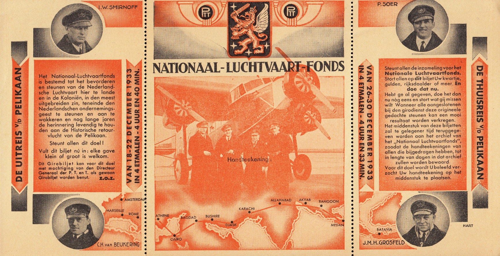 * Het Nationaal Luchtvaartfonds werd begin 1934 gesticht om de herinnering levend te houden aan de postvlucht Schiphol-Batavia-Schiphol die in slechts dertien dagen werd voltooid, eind 1933, en in Nederland een geweldig enthousiasme voor de luchtvaart ontketende. Dit biljet is voorzien van foto’s van de vliegvelden Schiphol, Twenthe en Waalhaven, van het Fokker-vliegtuig en van de vier luchthelden, en gedrukt door Grafische Inr. Ruygrok & Co. te Haarlem.