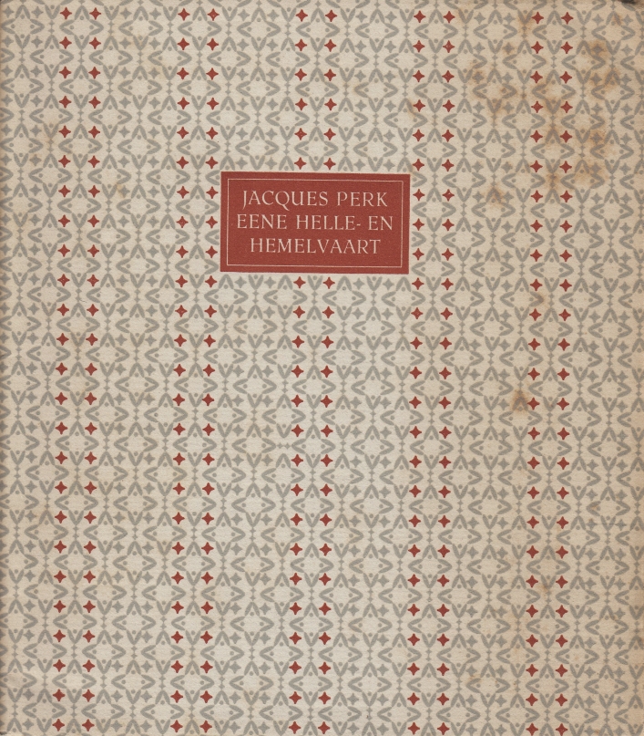 32. (MEIDOORN). PERK, Jacques Eene helle- en hemelvaart. Sonnettenkrans. [Amsterdam], (Vijf Ponden Pers), 1940 [=1943]. 19 x 17 cm. Ingenaaid met omslag. Gezet uit de Meidoorn en gedrukt in rood en zwart op lichtgrijs Barcham Green in een oplage van 55 exemplaren. Omslag en typografie van S.H. Roos. Onopengesneden exemplaar, mooi, maar de rechterkant van het omslag is iets verbruind. Met inliggend het verzamelaarsbriefje van A.J. Eschauzier: dit boek kocht de grote clandestienenverzamelaar in 1961 voor zestien gulden bij L.J.C. Boucher!
