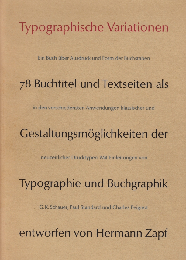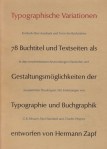 49. ZAPF, Hermann Typographische Variationen. 78 Buchtitel und Textseiten als Gestaltungsmöglichkeiten der Typographie und Buchgraphik entworfen von Hermann Zapf. Frankfurt, Georg Kurt Schauer, 1963. 31 x 21 cm. Halfperkament met stofomslag en bijbehorend foedraal. (8), 124 p. Met 100 alfabetten en andere letterproeven. Gedrukt in 500 genummerde exemplaren, gesigneerd door Hermann Zapf. Voorwoord van Charles Peignot. 1e druk. Foedraal iets verkleurd, verder mooi.