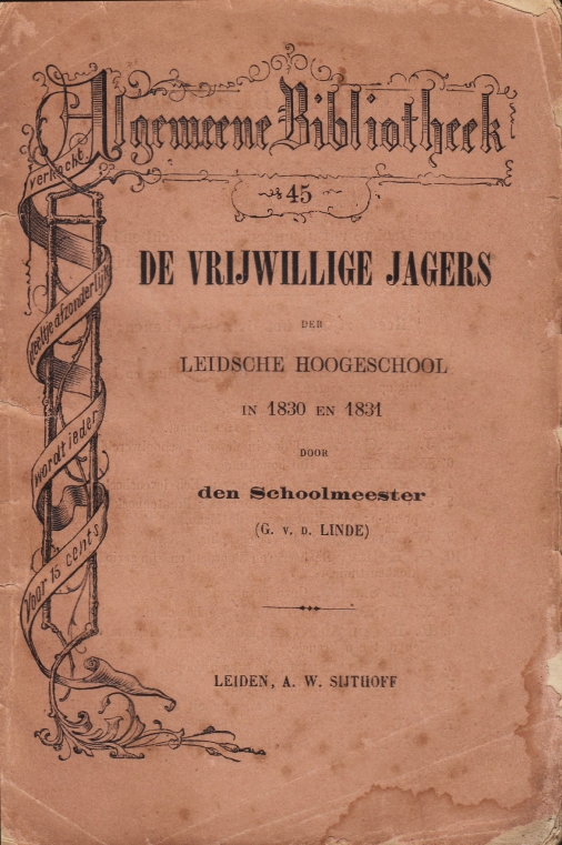 26. LINDE, Gerrit van de De vrijwillige jagers der Leidsche hoogeschool in 1830 en 1831. Door den Schoolmeester (G.v.d. Linde). Leiden, A.W. Sijthoff, (ca. 1872). Algemeene Bibliotheek nr. 45. 15 x 10 cm. Ingenaaid. 56 p. Niet afgesneden. Met uitvoerige naamlijsten van deze soldaten. 1e druk. Wat gevlekt en aan de randen beschadigd.