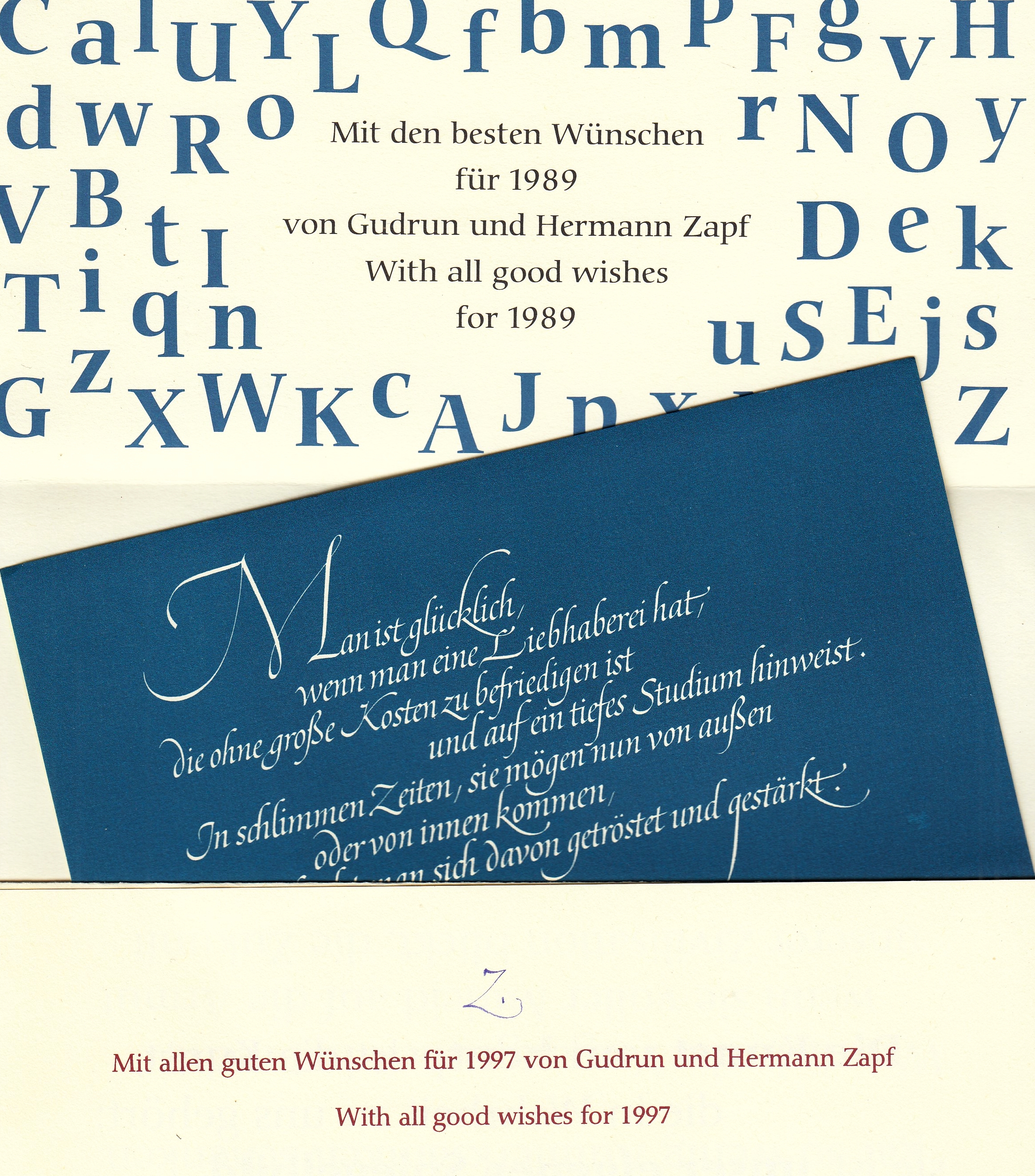 50. ZAPF, Hermann & Gudrun ZAPF-VON HESSE Negen gedrukte nieuwjaarswensen naar eigen ontwerp van het echtpaar Zapf (1989-1997). Verschillende formaten gevouwen bladen, alle in enkele kleuren gedrukt op getint papier. Soms naar kalligrafie van Zapf, soms in een door hem ontworpen letter. Lapidaire teksten van grote kunstenaars, zoals Goethe, Seneca, Picasso (‘Unter den Menschen gibt es mehr Kopien als Originale’), Schopenhauer, maar ook een reproduktie van een tekening van Zapf en een alfabet van Zapf-von Hesse. Goede staat. Opeenvolgende jaren 1989-1997.