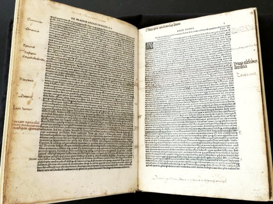 Folio, 31 x 20 cm. Modern perkament, schutbladen vernieuwd, laatste blanco blad ontbreekt. Met exlibris van de Bibliotheca Philosophica Hermetica te Amsterdam. 65 bladen. Vertaald uit het Grieks in het Latijn door Georgius Trapezuntius. Met inhoudsopgave, gedichten en nawoord aan Albertus Vonicus Tarvisanus door Hieronymus Bononius. Grote en kleine houtsnede-initialen, waarvan de eerste ingekleurd is. Eigenaarsmerk op de titelpagina, veel contemporaine marginalia en droedels, wijzende vingers en onderstrepingen in verschillende handen en kleuren, en op de colofonpagina enkele eigenaarsmerken en de handgeschreven datum 1515. Enkele kreukjes.