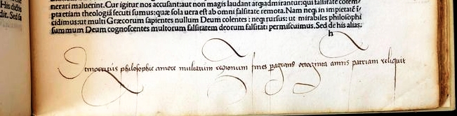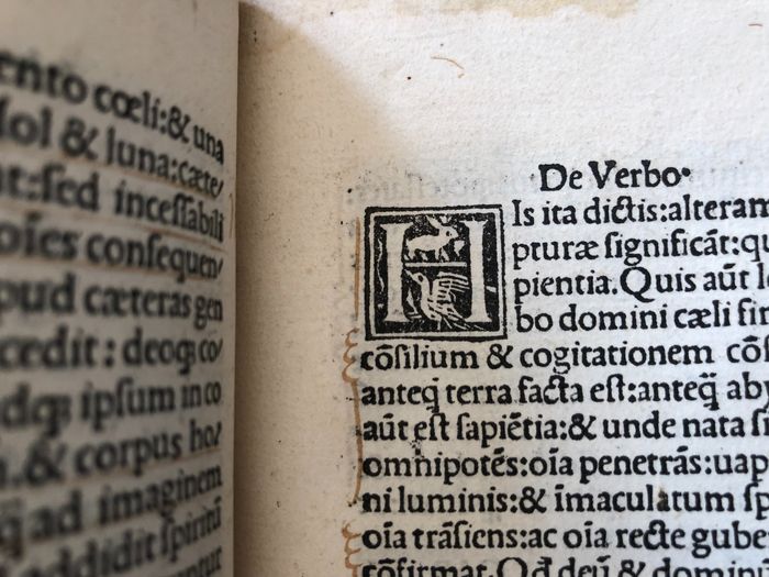 * Een charmante incunabel, van het einde van het laatst mogelijke jaar 1500. Vol grappige kleine houtsnede-initialen versierd met konijnen, gevleugelde muizen, bloemen en vogels, maar ook renaissancemannen en -monsters. Een paar keer werd een omgekeerde A gebruikt als een V! Ook veel van de handgeschreven toevoegingen zijn een lust voor het oog, zowel kalligrafisch als inhoudelijk.