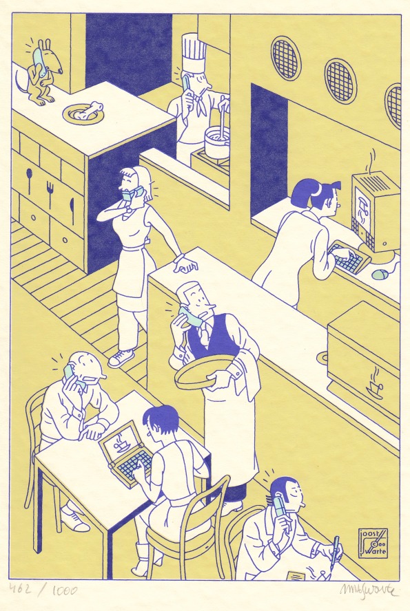 * Niet gedateerd, maar gezien de voorstelling schatten we de prent uit circa 2000: een horecagelegenheid waarin iedereen, ook de hond, aan het bellen is met een mobiele telefoon.