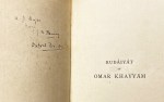 40. OMAR KHAYYAM Rubáiyát of Omar Khayyám, the Astronomer-Poet of Persia, Rendered Into English Verse. London, Macmillan & Co., 1891. Origineel perkament met gouden lijnen. (4), 112 p. Niet afgesneden. Herdruk. Perkament wat donker, schutbladen verbruind, verder heel mooi en ongevlekt. Met opdracht van C.J.N. Fleming aan A.J. Boger, ‘Oxford Dec. 1892’.