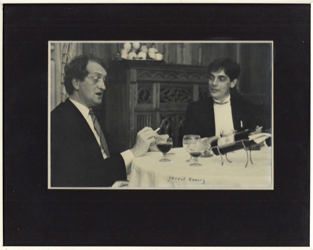 * De foto’s zijn afkomstig uit catalogus 30 van Antiquariaat Willem Huijer, verschenen in 1984 ter gelegenheid van Komrijs veertigste verjaardag. Op de ene foto zien we een nog jonge Komrij met zijn arm om Charles Hofman, op de andere foto zitten de heren in pak in een sjiek restaurant aan de wijn. Beide foto’s gesigneerd door Komrij. Een exemplaar van de genoemde catalogus van Willem Huijer is bijgevoegd.