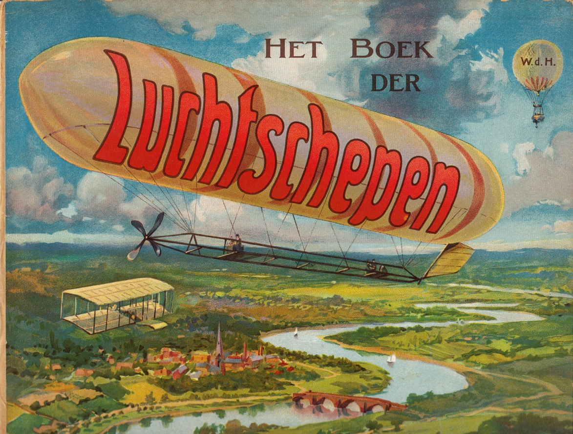 14. HAAN, W. de Het Boek der Luchtschepen. Utrecht, W. de Haan, [1909]. Oblong 23 x 28 cm. Omslag in chromolitho. 12 p. Met 4 kleurenillustraties, 6 in één kleur en 2 geïllustreerde tekstpagina’s met een kinderrijm. 1e druk. Goede staat zonder beschadigingen of reparaties.