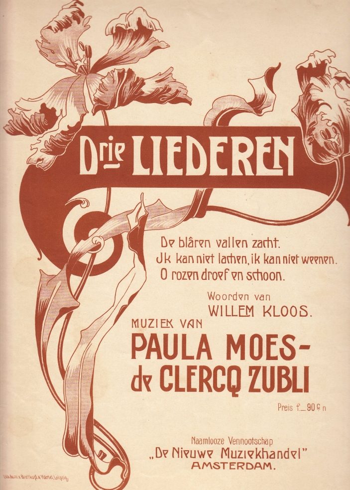 1. Drie Liederen. De blâren vallen zacht. Ik kan niet lachen, ik kan niet weenen. O rozen droef en schoon. Muziek van Paula Moes-de Clercq Zubli. Amsterdam, N.V. “De Nieuwe Muziekhandel”, [1900]. 34 x 26 cm.