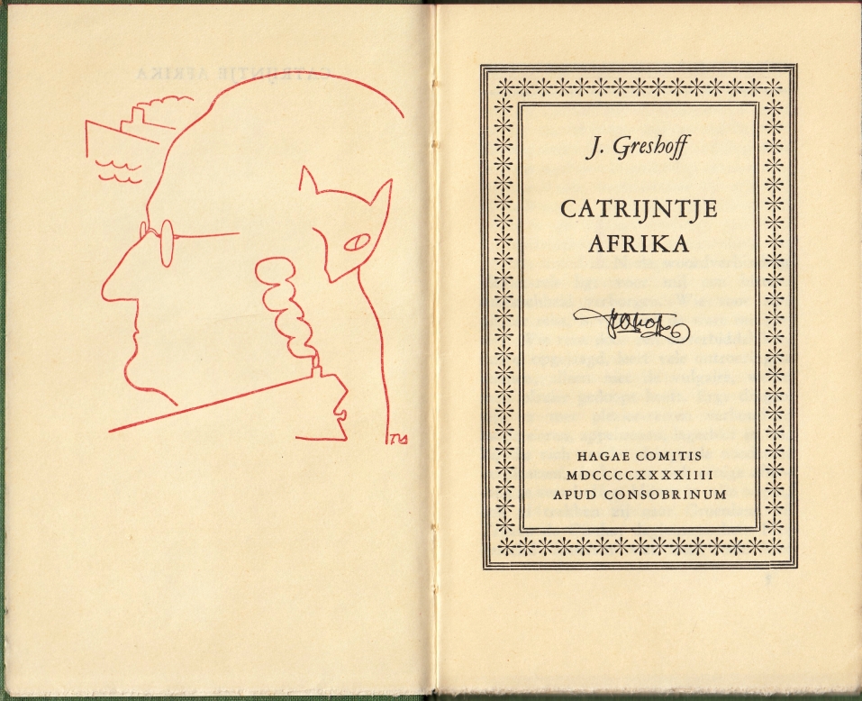 25. GRESHOFF, J. Catrijntje Afrika. (1/50 luxe-exemplaren). Hagae Comitis, apud Consobrinum [= Den Haag, Huib van Krimpen], 1944. Linnen. 44 p. Onafgesneden. Met een in rood gedrukt frontispice door Tinus van Doorn. 1e druk. Exlibris van F.J. van Nijendaal.