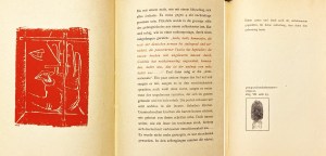 20. (BRUSSE, Wim) heute hat meine Frau Geburtstag… Die Internationale. erinnerungen aus einem gestapo-gefängnis im winter 1942-43. (Met 7 illustraties van Wim B[russe]). [Amsterdam?], eigen beheer, 1946. Ingenaaid. (32) p. [Typografie W. Sandberg?]. Gedrukt in rood en zwart [in een oplage van 500 exemplaren]. 1e druk. Scheurtje in achterzijde omslag.