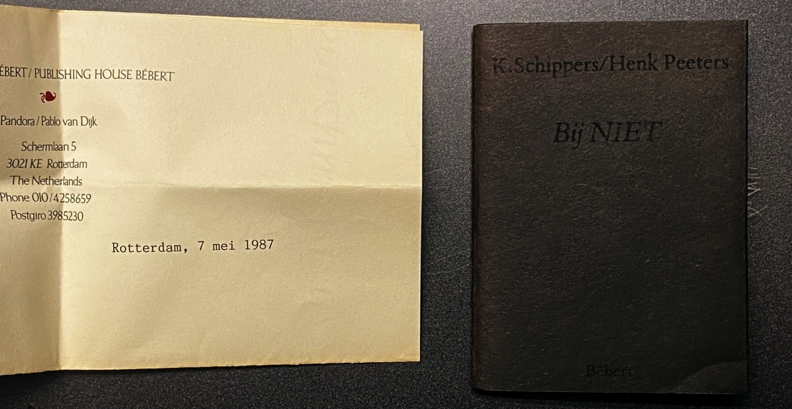 * Verscheen ter gelegenheid van het verschijnen van NIET. Dit miniboekje bestaat uit een gedrukte brief van Schippers aan Peeters (‘Jij bent nu eenmaal de lyricus van zero, misschien nog meer dan Jan Schoonhoven’), waartegenover een mooi wit donsveertje is aangebracht. Inliggend een getypte brief van ‘Pandora/Pablo van Dijk’ aan ‘Geachte mevrouw Kieviet’: ‘Omdat het leuk was u eens te ontmoeten en omdat u vast ook een fantastische moeder bent, een aardigheidje’.