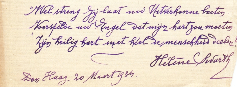 44. SWARTH, Hélène Piëta. (Handgeschreven gedicht). Gelinieerd blad, 18,8 x 11,8 cm. Gesigneerd ‘Hélène Swarth’ en gedateerd Den Haag, 20 Maart 1934′. Horizontaal gevouwen en met wat randkreukjes en -scheurtjes.