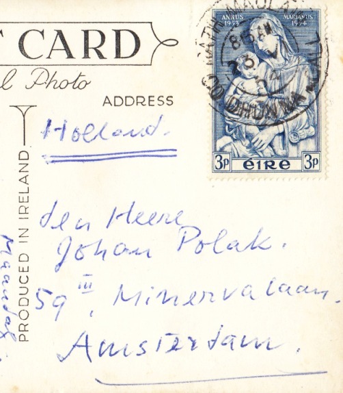 38. ROLAND HOLST, A. Handgeschreven ansichtkaart aan ‘Den Heere Johan Polak’. 8,8 x 14,2 cm. Met op de beeldzijde een foto van het strand bij Inver in het noorden van Ierland. Gesigneerd ‘A. Roland Holst’ en gedateerd ’21.VI.’54’. 10 regels tekst.