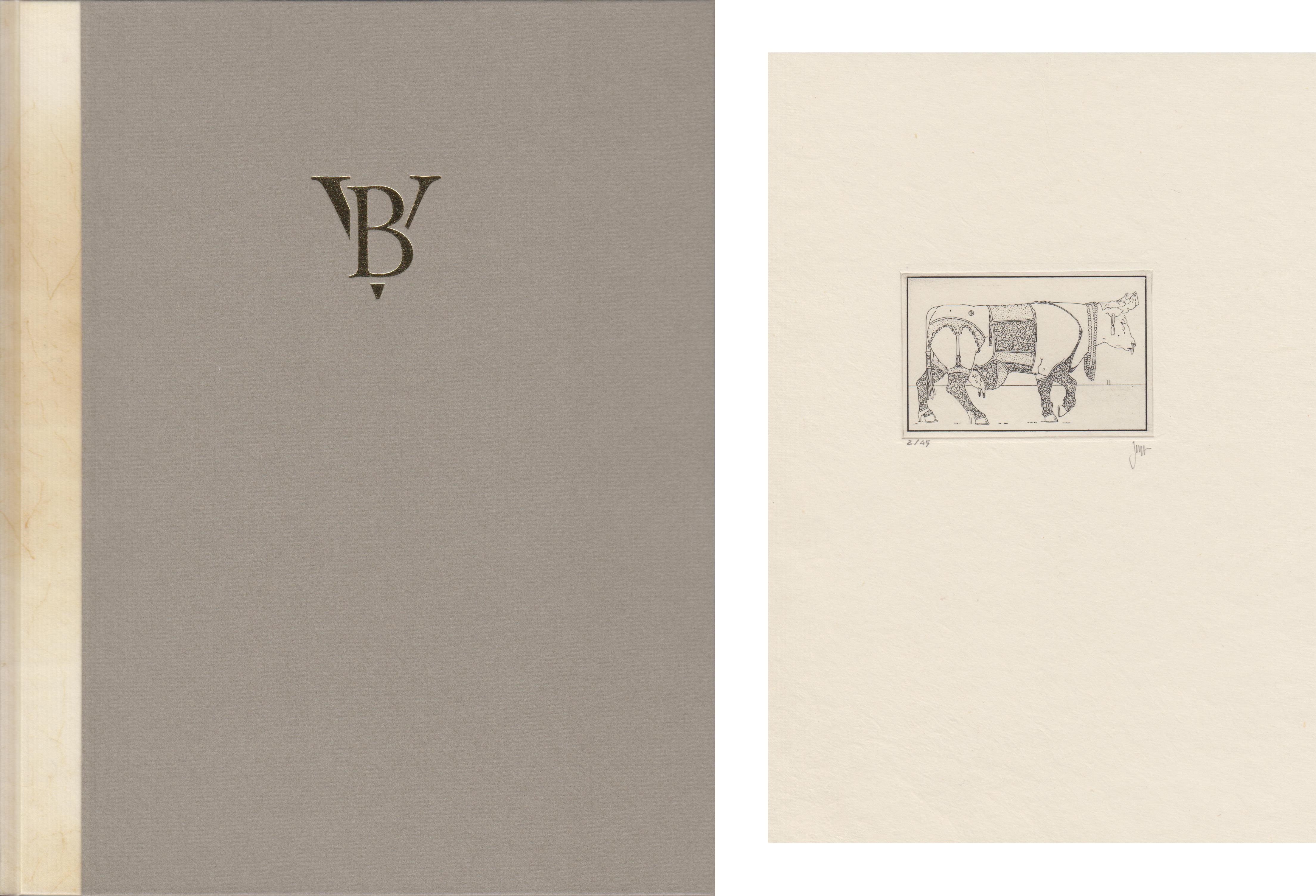* Eén van de 45 luxe-exemplaren, gebonden in halfperkament en voorzien van aangapaste schutbladen. Dit is een HC-exemplaar, wel gesigneerd door Scholten en Veerkamp en mét de in het colofon beloofde losse ets van Joost Veerkamp, gesigneerd en gemarkeerd ‘HC’. De vier geprinte nachtprenten zijn los ingevoegd. Een volmaakte uitgave, tot in de puntjes verzorgd (schutbladen met rustende en grazende runderen), met schitterende, gevoelsrijke mezzotinten van Veerkamp, die ook een tekstbijdrage leverde (‘De V-snaar’) en speciaal hiervoor geschreven gedichten van Scholten. Met, los bijgevoegd, een extra suite van de vier kleurentekeningen op ander papier. Prachtige ode aan de koe!