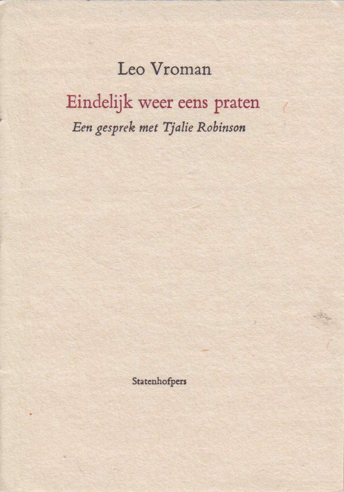 40. VROMAN, Leo Eindelijk weer eens praten. Een gesprek met Tjalie Robinson. Den Haag, Statenhofpers, (1994). 14 x 10 cm. Cahiersteek. (12) p. Met de hand gezet uit de Bembo en gedrukt op Kawashi door Jaap Schipper in rood en zwart in een oplage van 75 exemplaren.