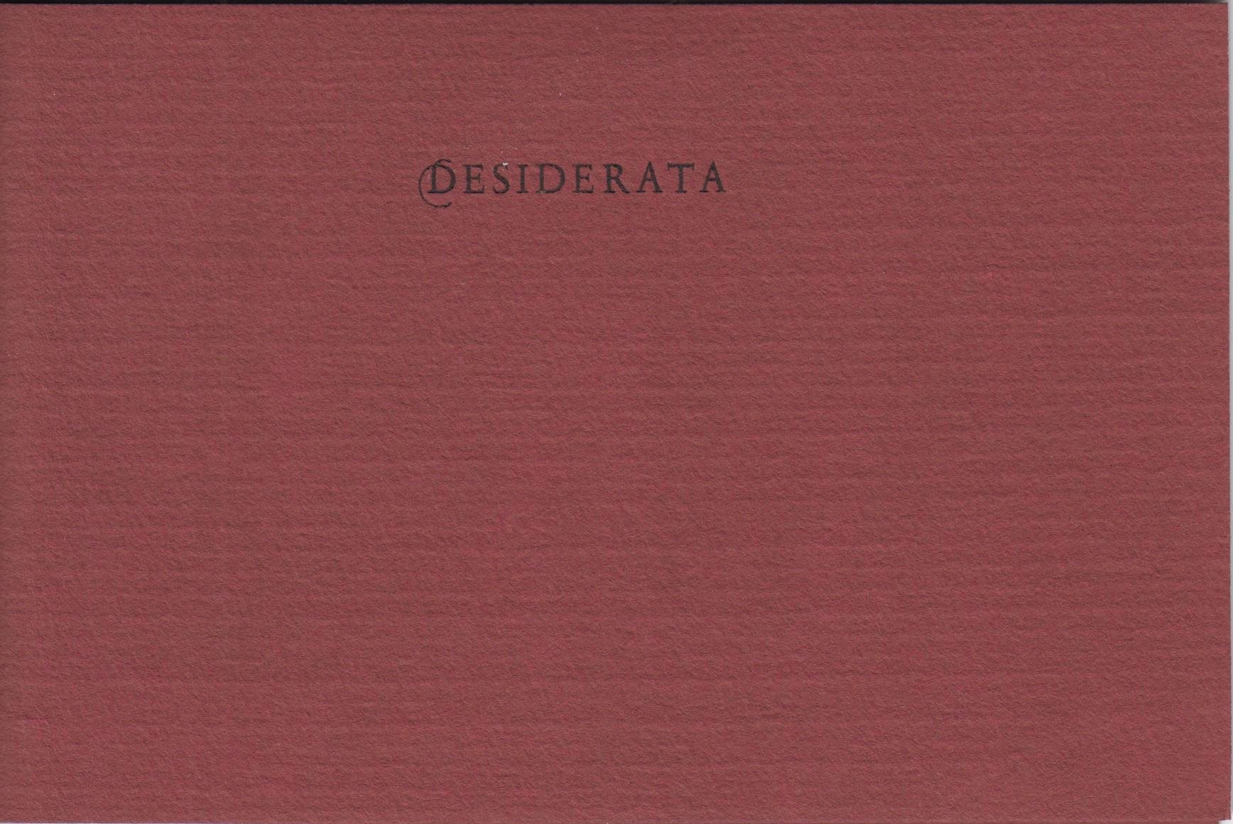 2. (BASTET, F.L.) Desiderata. Woubrugge/ Den Haag, Avalon Pers/ Statenhofpers, 2006. Oblong. Cahiersteek. (12) p. Met de hand gezet uit de Romanée en gedrukt in roodbruin en zwart in een oplage van 50 exemplaren.