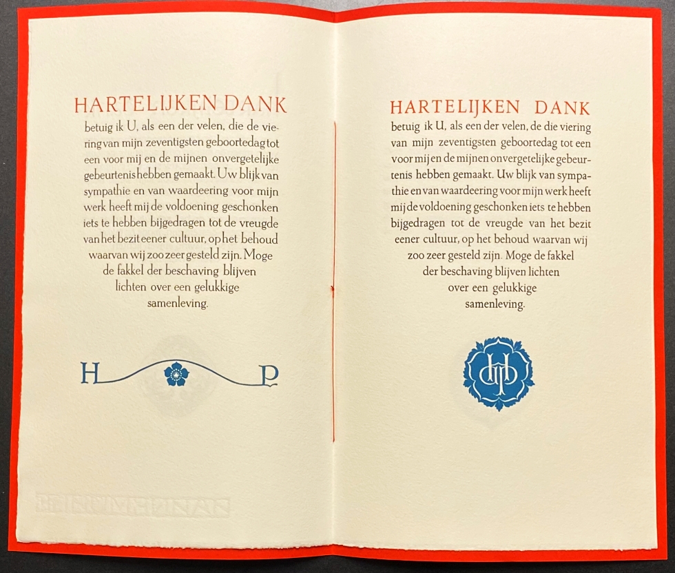 25. ROOS, S.H. de Dank. (Den Haag, Statenhofpers), [1995]. Ingenaaid. (8) p. Met de hand gezet uit de Libra, de Egmont en de De Roos en gedrukt in rood, blauw en zwart in een oplage van 80 exemplaren. 1e druk.