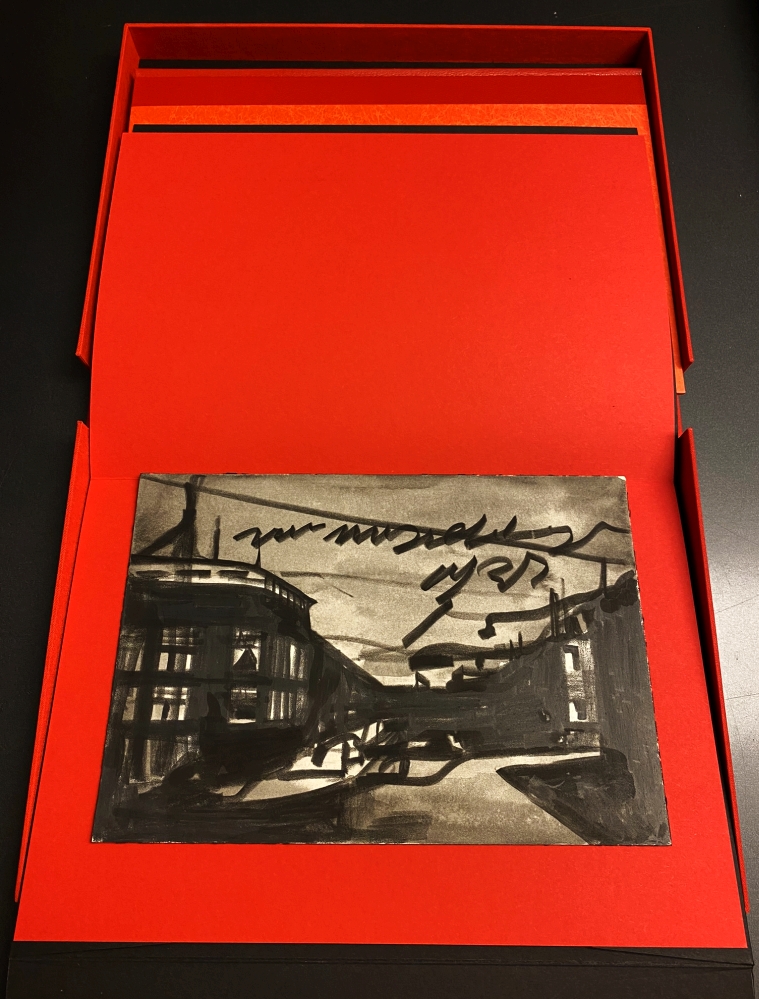 26. ROTENSTREICH, Mirjam Natan. (Met tekeningen én, los bijgevoegd, een originele, genummerde en gesigneerde litho van Sam Drukker) Den Haag, Statenhofpers, 2019. Halfleer in foedraal (Binderij Phoenix). 48 p. Gedrukt door Jan de Jong op Magnani Pescia Editions-papier in een oplage van door auteur en kunstenaar gesigneerde exemplaren.