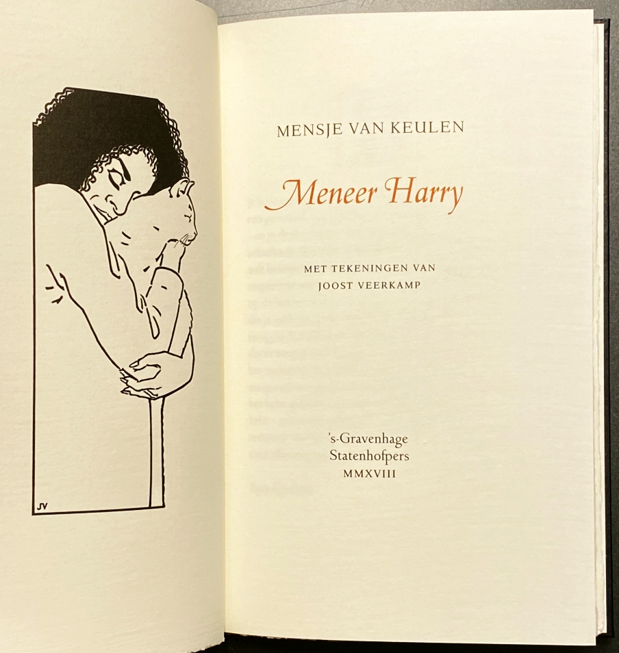 18. KEULEN, Mensje van Meneer Harry. Met tekeningen van Joost Veerkamp. Den Haag, Statenhofpers, 2018. Halfperkament in foedraal (Frans den Breejen). 44 p. Gezet uit de Monotype Lutetia Nova Book en gedrukt door Jan de Jong op Zerkall Bütten in een oplage van 85 genummerde en door auteur en kunstenaar gesigneerde exemplaren. 1e druk.