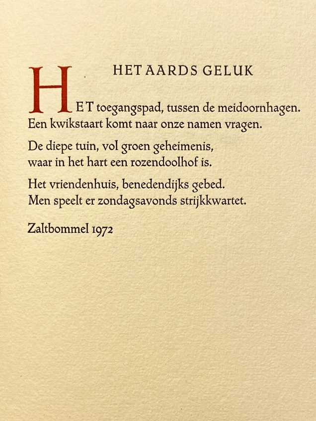 11. GERHARDT, Ida Het aards geluk. Den Haag, (Statenhofpers), 2003. Cahiersteek met stofomslag van vezelig papier. (8) p. Met de hand gezet uit de Meidoorn en gedrukt door Jaap Schipper in een beperkte oplage.