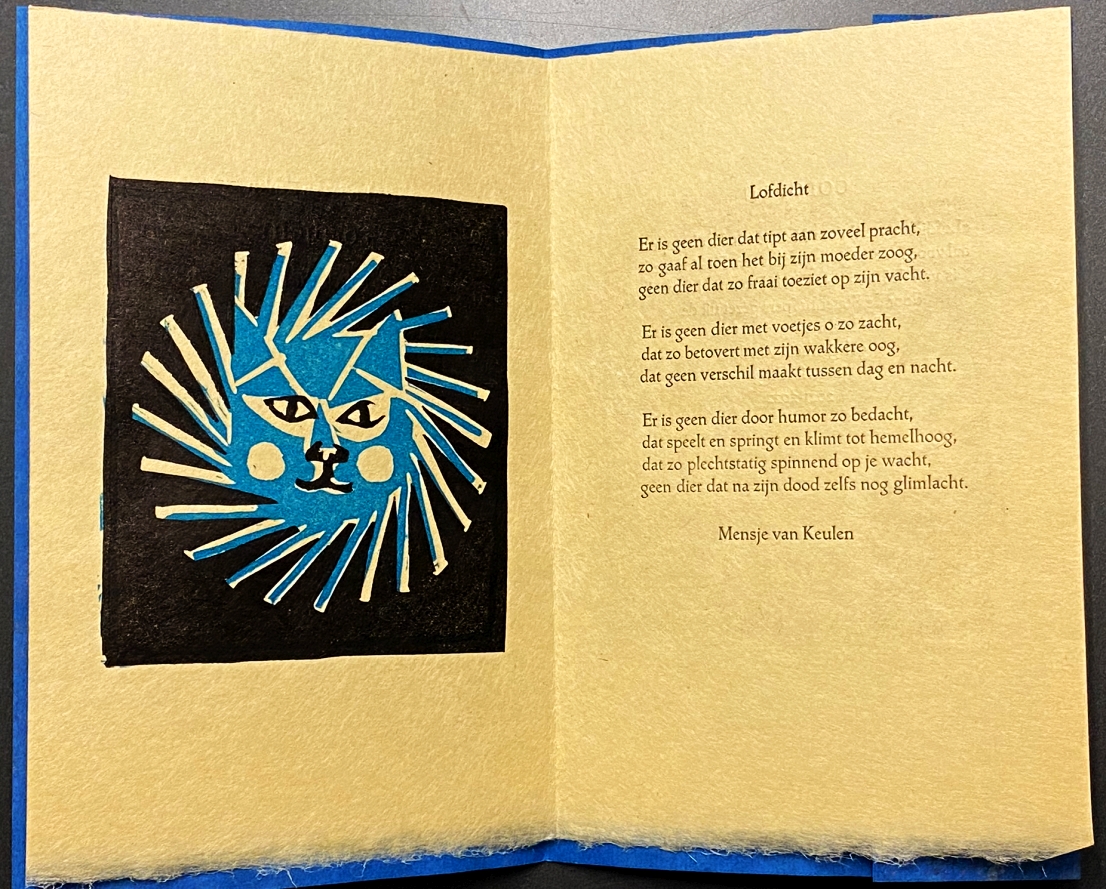 17. KEULEN, Mensje van Lofdicht. (Met een originele tweekleurenlino van Olivia Ettema). [Den Haag], (Statenhofpers, 2021). Vouwblad in omslag van bijzonder mooi blauw-zilverig handgemarmerd papier, voorzien van een vrolijk drukkersmerk eveneens van Ettema). Met de hand gezet uit de Meidoorn en gedrukt door Jaap Schipper in een beperkte oplage. 1e druk.