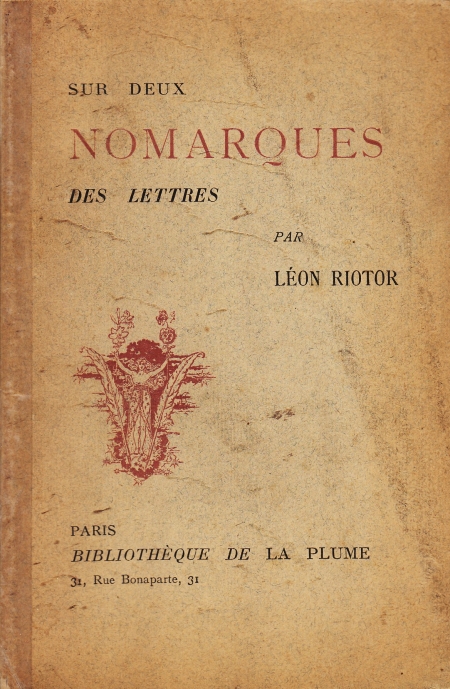 12. RIOTOR, Léon Sur deux Nomarques des Lettres. Parijs, Bibliothèque de la Plume, [1894]. Ingenaaid. 76 p. 1e druk. Rugje verstevigd met plakband. Omslag wat gevlekt.