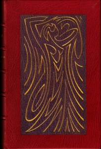 * Dit is een van 100 luxe-exemplaren in heelleer met 16 elegante houtgravures in groot formaat van Buckland Wright. De in het colofon beloofde, extra houtgravure ontbreekt helaas. De magnifieke boekband maakt dat goed, met aan beide zijden ingelegd marokijn met fonkelend gouden versiering van JBW, bijna abstract, maar toch is de bij hem alomtegenwoordige gracieuze vrouwengestalte erin te herkennen.