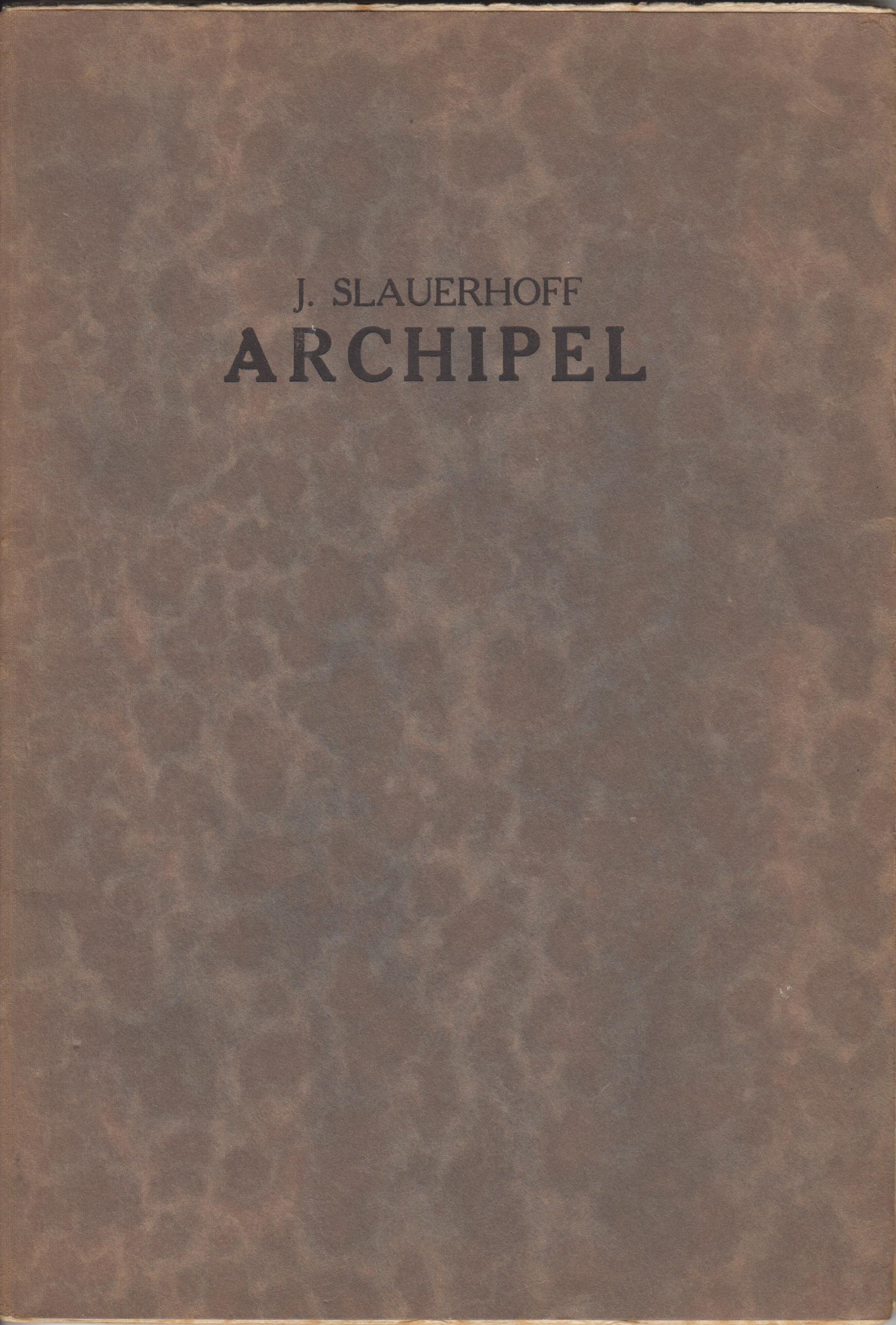 20. SLAUERHOFF, J. Archipel. Amsterdam, Van Kampen, 1923. Ingenaaid. 60 p. [Gedrukt in een oplage van 400 exemplaren]. Debuut. 1e druk. Scheefgelezen, omslag wat roestig en langs bovenrand gerafeld.