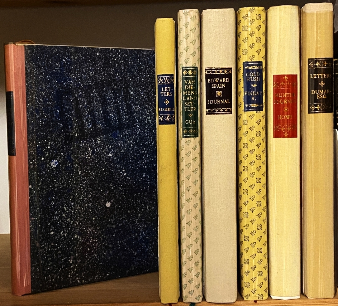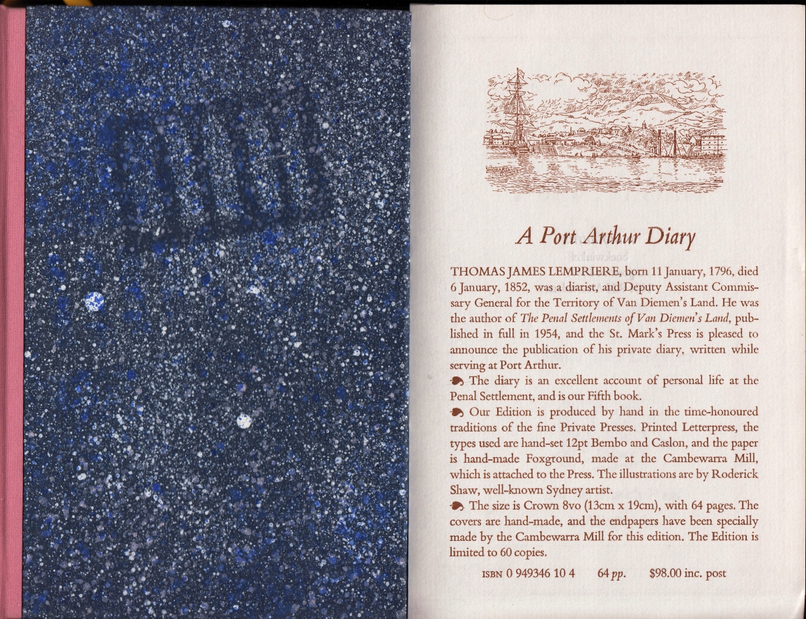 * Met twee iets verschillende prospectussen. Dagboek (1834-1836) van een op Tasmanië gevestigde winkelier (later bestuurder, kunstschilder en lijkschouwer) met inleiding en sfeervolle illustraties. Het vijfde boek van de St. Mark’s Press.