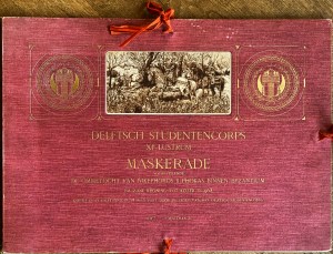 23. (WETSTEIN PFISTER, J.J.R. de). STUDENTENMASKERADE DELFT 1903 Maskerade voorstellende de ommetocht van Nikephoros II Phokas binnen Byzantium na zijne kroning tot keizer in 963. Gehouden te Delft op den 14 July 1903 door de leden van het Delftsch Studentencorps. Delft, J. Waltman, 1903. Oblong 40 x 56 cm. Linnen portfolio met in verguld kader een originele ets van De Wetstein Pfister en belettering in goud, aan drie kanten oranje linten. Met 22 bladen, waarvan 14 in chromolithografie bedrukt met scènes uit de parade en 8 versierde tekstpagina’s, in grijze lithografie gedrukt (alles door Emrik & Binger). 1e druk. Portfolio en bladzijden vertonen een klein beetje randslijtage; hier en daar roestplekjes.