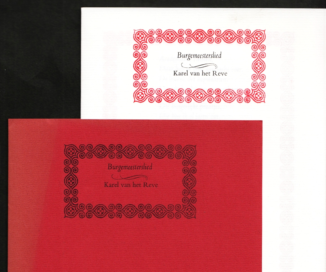 18. REVE, Karel van het Burgemeesterslied. [Woubrugge, Avalon Pers, 2009]. Twee vouwbladen in omslag. Met de hand gezet uit de smalle Bembo en gedrukt in rood en zwart in een beperkte oplage. 1e druk. Omslag deels verschoten.