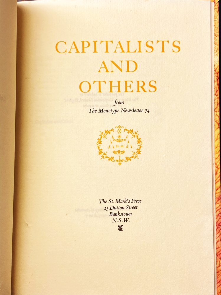 * Het eerste boek van de St. Mark’s Press. Qua formaat en typografie wijkt het een beetje af van de latere zeven uitgaven, die getuigen van een streven naar uniformiteit. Een op het eerste gezicht weinig inspirerende titel, maar het boek gaat over spelling, of liever over het gebruik van kapitaal in Engels zetwerk: ‘in doubt – keep down’. (Niet een algemeen geaccepteerd advies.).