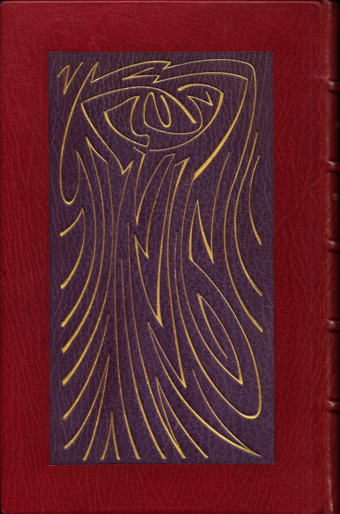 * Dit is een van 100 luxe-exemplaren in heelleer met 16 elegante houtgravures in groot formaat van Buckland Wright. De in het colofon beloofde, extra houtgravure ontbreekt helaas. De magnifieke boekband maakt dat goed, met aan beide zijden ingelegd marokijn met fonkelend gouden versiering van JBW, bijna abstract, maar toch is de bij hem alomtegenwoordige gracieuze vrouwengestalte erin te herkennen.