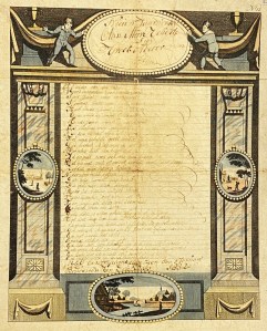 16. NIEUWJAARSWENS Handgeschreven Nieuwjaarswensch (van Boudewijn van den Bosch aan Trijntje Paling), 1 januari 1832. Voorgedrukte en handgekleurde sierlijst met dorpsgezichtjes, twee jongetjes en sierzuilen. 41 x 34 cm. Op karton geplakt. Aan de randen wat versleten en stoffig. Wat verbleekt.