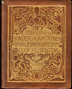 5. BOUTENS, P.C. (vert.). OMAR KHAYYAM Rubaiyat. Honderd kwatrijnen van Omar Khayyam, vertaald door P.C. Boutens. Bussum, Van Dishoeck, 1913. Rijkverguld bruin goudleer (bandontwerp C.A. Lion Cachet). (8), 104 p. Op geschept papier. 1e druk. Rug bovenaan beschadigd.