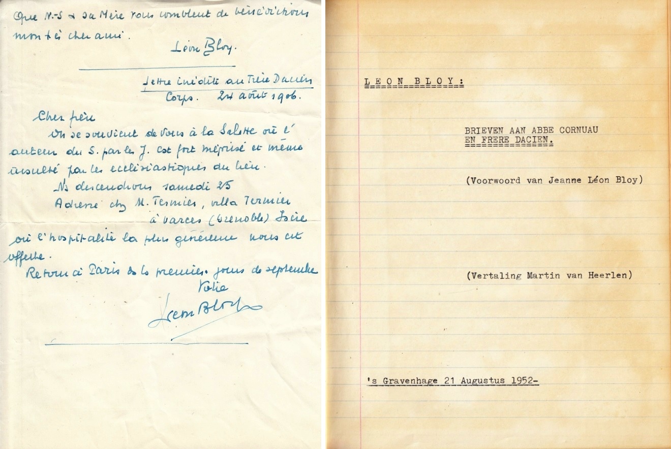2. BLOY, Léon Brieven aan Abbé Cornuau en Frère Dacien. (Voorwoord van Jeanne Léon Bloy. Vertaling Martin van Heerlen). Typoscript van een Nederlandse vertaling van de correspondentie van Bloy met Cornuau en Dacien, die in 1923 in druk verscheen. In een in linnen gebonden schrift. (6), 114 p. Gedateerd ”s Gravenhage 21 Augustus 1952′.