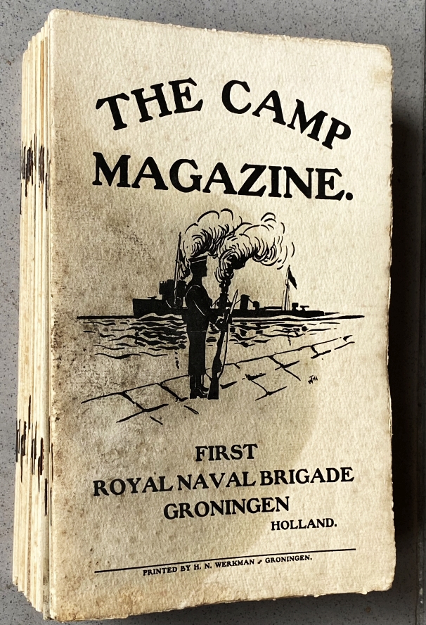 19. (WERKMAN, H.N.) The Camp Magazine. Groningen, Holland. Being the Periodical of the 1st Royal Naval Brigade, interned in Holland. 1915-1918 (37 van de 44 nummers). Groningen, H.N. Werkman, 1915-1918. Geniet. De meeste nummers met omslag. Sommige zijn in druk verkeerd genummerd, dat is dan in handschrift verbeterd. Ca. 16 bladzijden per nummer. Geïllustreerd. 1e druk. Deze nummers zijn afkomstig uit de drukkerij van Werkman; zijn opvolger Bos heeft na de oorlog een flinke stapel aan Werkmans dochter Fie gegeven, maar niet voordat er een terpentijnlekkage was opgetreden: de eerste vier nummers en ook drie latere zijn daardoor in meerdere of mindere mate gevlekt – edoch goed leesbaar en inmiddels geurloos.