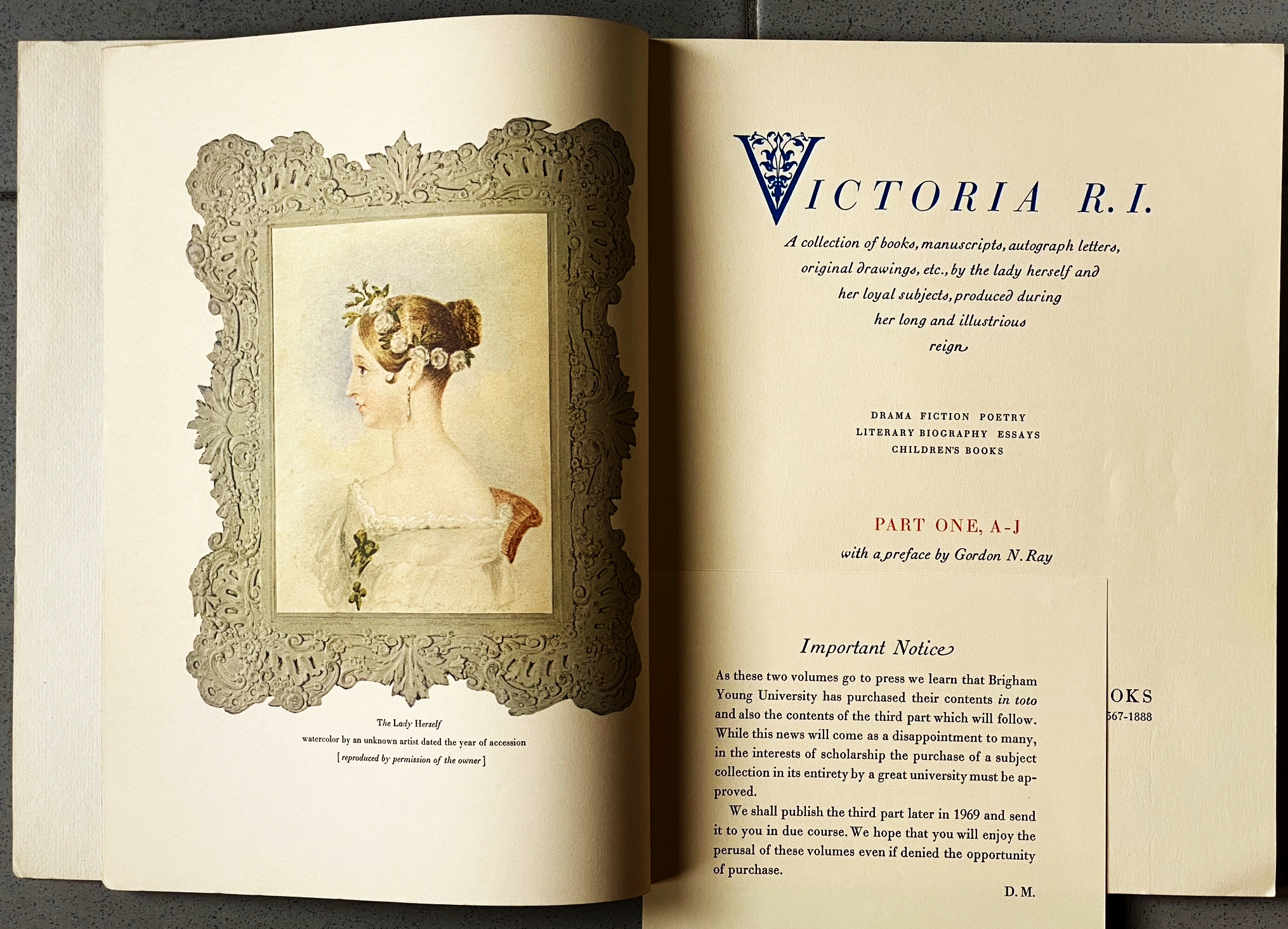 18. VICTORIA, QUEEN Victoria R.I. A Collection of Books, Manuscripts, Autograph Letters, Original Drawings, etc., by the Lady Herself and her Loyal Subjects, Produced During her Long and Illustrious Reign. (Compleet in drie delen). San Francisco, David Magee, 1970. A4-formaat. Samen 308 p. Geïllustreerd. Gedrukt in 625 exemplaren. In alle delen een gedrukt briefje dat aangeeft dat de hele collectie vóór de publicatie van deze catalogi is verkocht aan de Brigham Young University in Provo, Utah. 1e druk. Rug wat verkleurd, verder mooi.