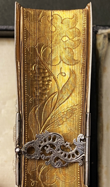 3. (BOEKBAND). GEBEDENBOEKJE God is mijn heil! Een gebedenboek voor Roomsch-Katholijken. Antwerpen, D. Spitaels, ca. 1862. 12 x 8 cm. Boekband van been of ivoor met reliëf: een kelk met een hostie rijst op uit een mand die rijk gevuld is met de vruchten des velds – korenaren, rozen, druiventrossen en vruchten. Alle sneden verguld met gedreven botanische versiering. Zilveren sluiting. In bijpassend zwart doosje, bekleed met in blinddruk versierd leder, van binnen versierd met satijngedekte kussens.