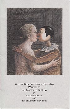80. GRUNBERG, Aron [=Arnon] Second Welcome Book Dinner for Whore C. July 17th, 21.00 Hours. (Met een illustratie door Roland Topor. Oplaag 13 exemplaren). New York, Arnon Grunberg/ Kunst Editions New York, 1998. Twee plano’s. Gedrukt in een oplage van 13 genummerde en door Hoer C. en Grunberg gesigneerde exemplaren. 1e druk.