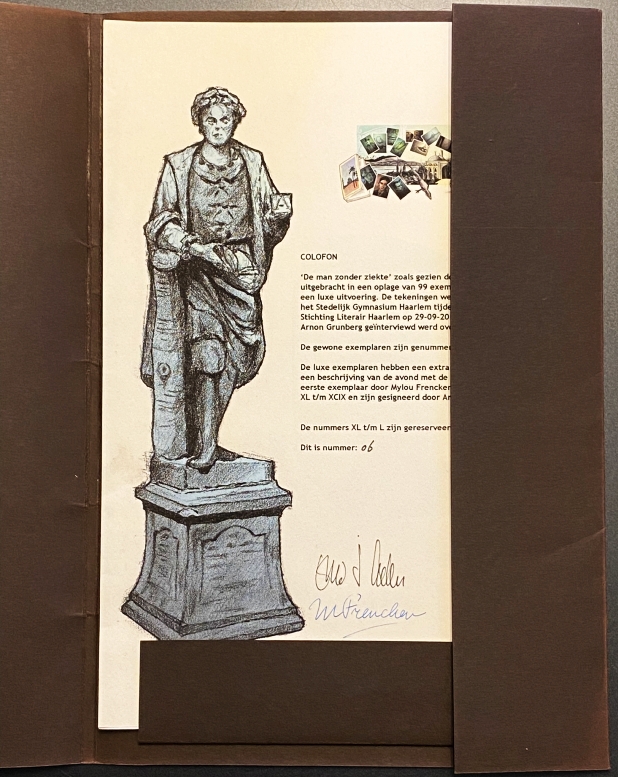 * Op 29 september 2012 werd Grunberg geïnterviewd door Mylou Frencken over zijn roman De man zonder ziekte op het Stedelijk Gymnasium Haarlem. Ter gelegenheid van die avond vervaardigde kunstenaar Eric J. Coolen 28 illustraties bij Grunbergs nieuwe roman en verscheen onderhavige uitgave met een gesigneerde piëzografie. Eén van de 39 arabisch genummerde exemplaren zonder extra prent en zonder beschrijving van de avond.