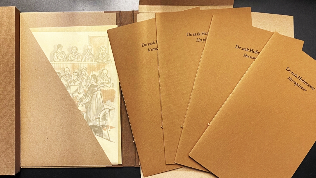 61. GRUNBERG, Arnon De zaak Hofmeester. Andelst, Uitgeverij Ekstreem, 2014. Vier cahiers + dossier in envelop, tezamen in halflinnen overslagdoos in cassette (Atelier de Distelkamp/ Geert van Daal). (16); (12; (12) (8) p Met de hand gezet en gedrukt door De Uitvreter in een oplage van 144 genummerde en door Officier van Justitie en rechtbankvoorzitter gesigneerde exemplaren. 1e druk.